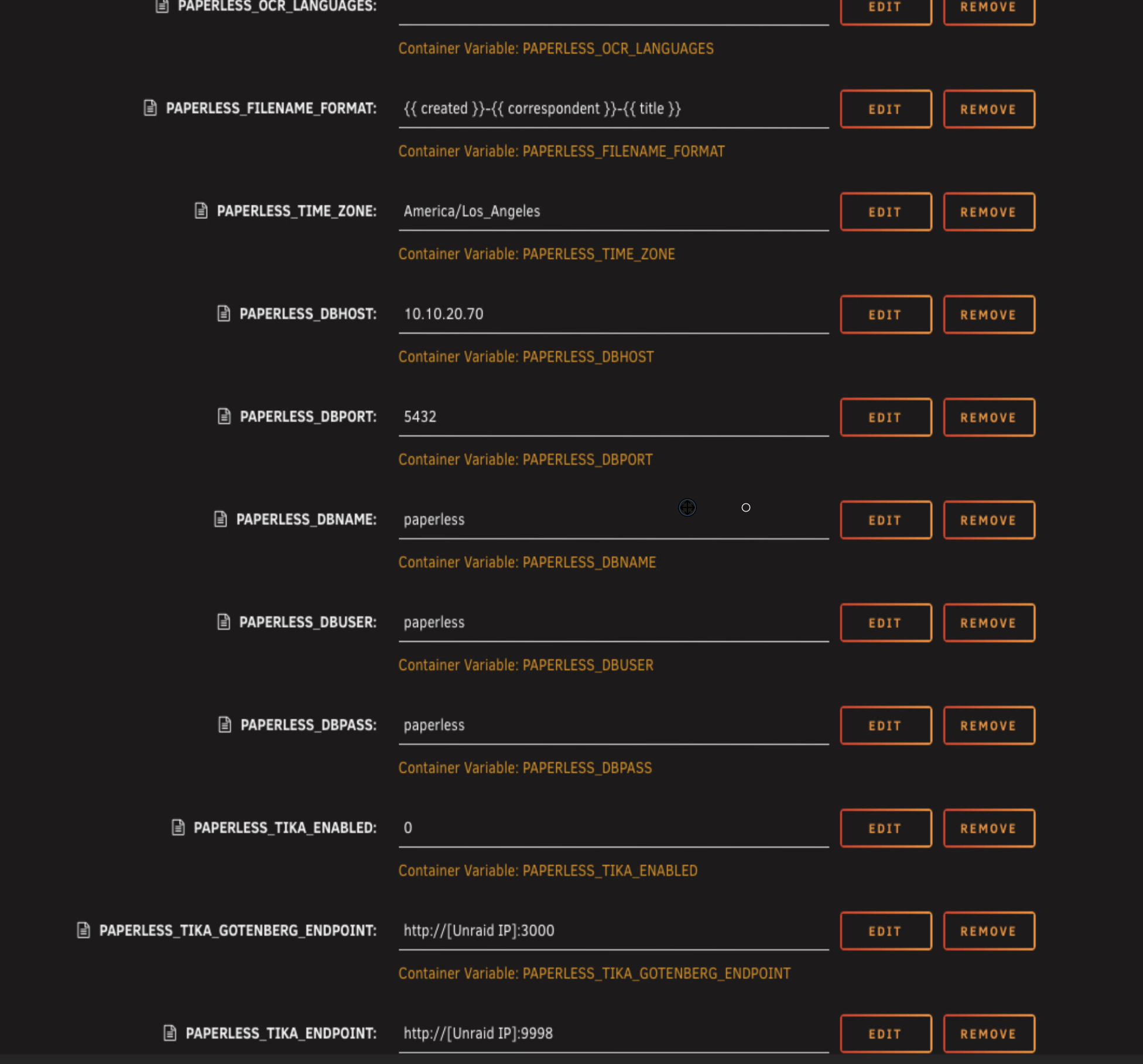 | Variable | PAPERLESS_DBHOST | 192.168.1.50 | IP address of your Unraid server |