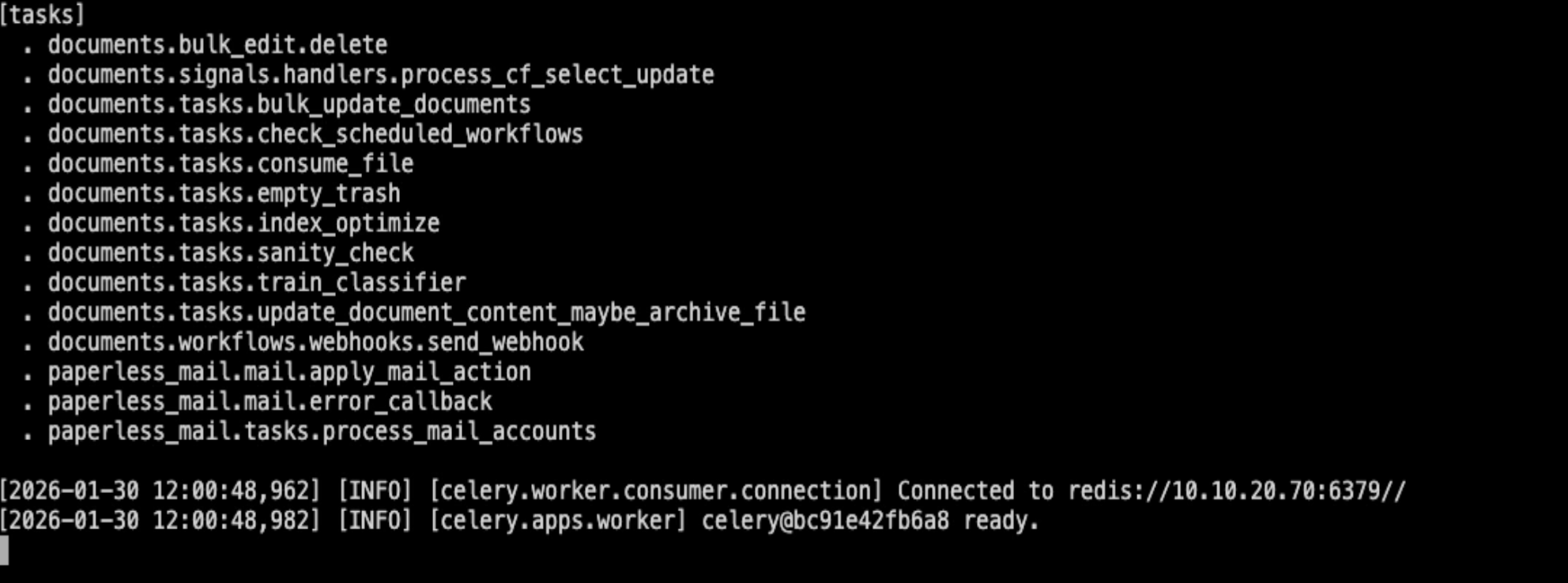If everything is working properly, you'll see Paperless connecting to Redis and Postgres, and the worker processes starting up. If you see logs like this, everything's working.