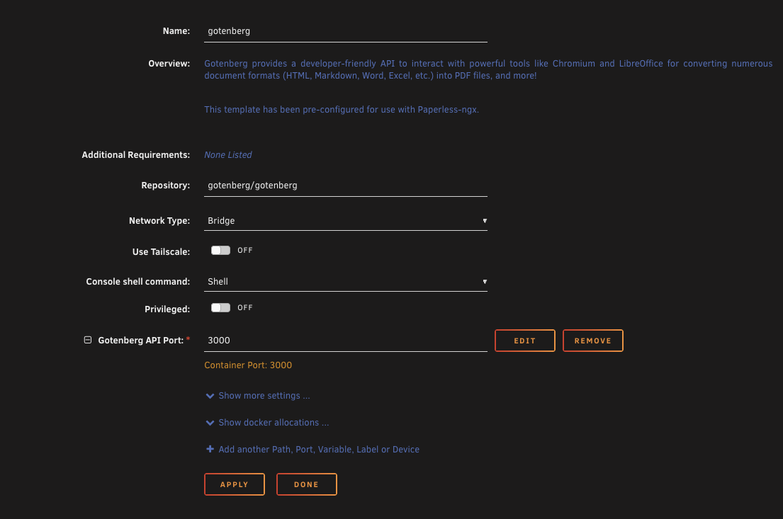 To make this work, we need two environment variables added to the Paperless container. Go to the Docker tab, edit the Paperless container template, and add these.