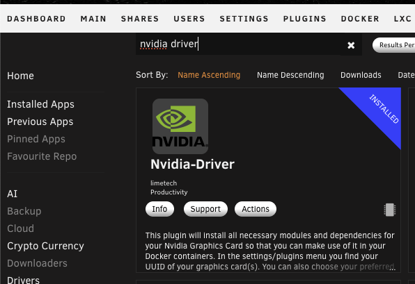 First thing we need is the Nvidia driver on the server with your GPU. Head to the Apps tab, search for Nvidia, and install the driver.