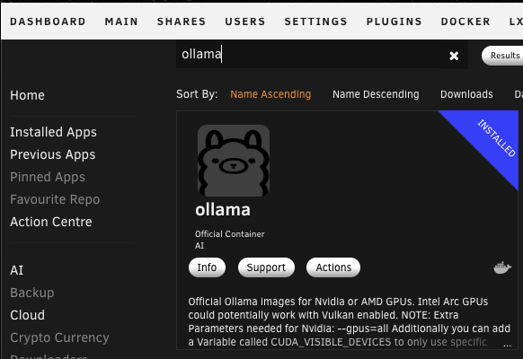 Head to the Apps tab and search for Ollama. Install the container.