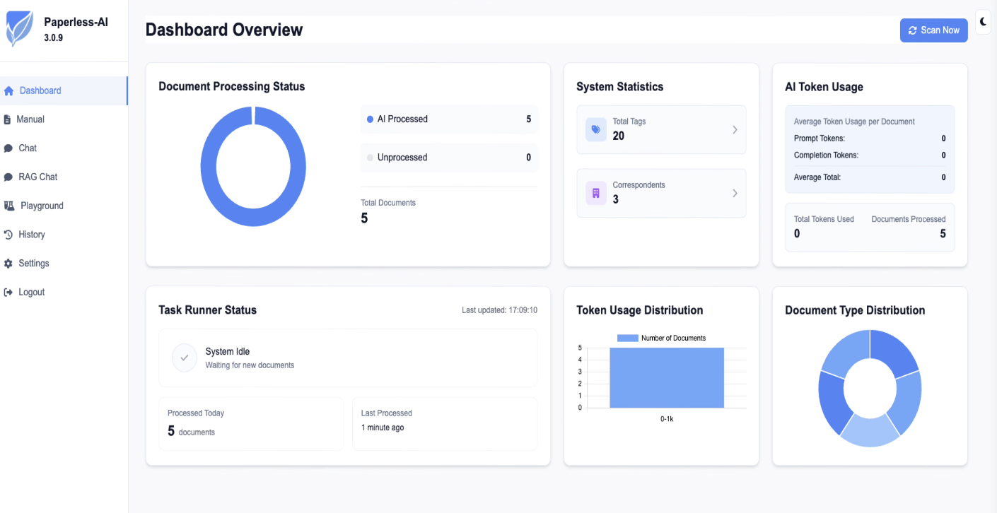 Log into Paperless AI and you'll see the dashboard. If it's already completed a scan, you'll see a count of documents that have been processed.