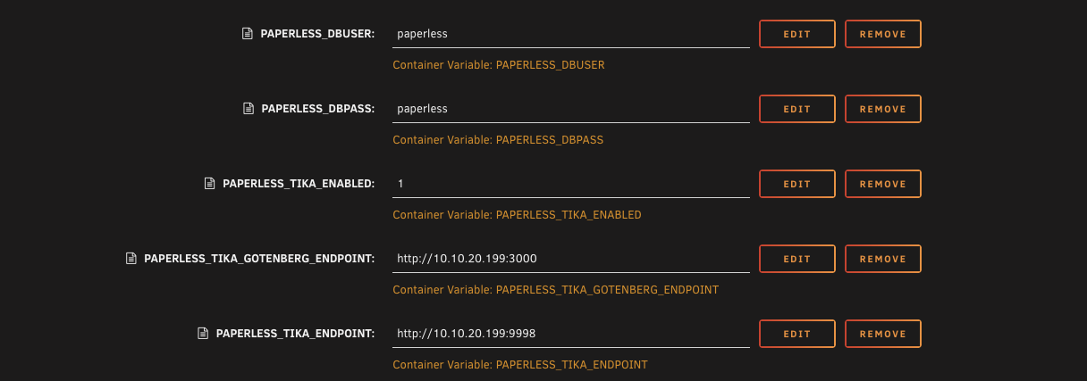 | Variable | PAPERLESS_TIKA_ENDPOINT | http://192.168.1.50:9998 | Tika endpoint (used later in this guide) |